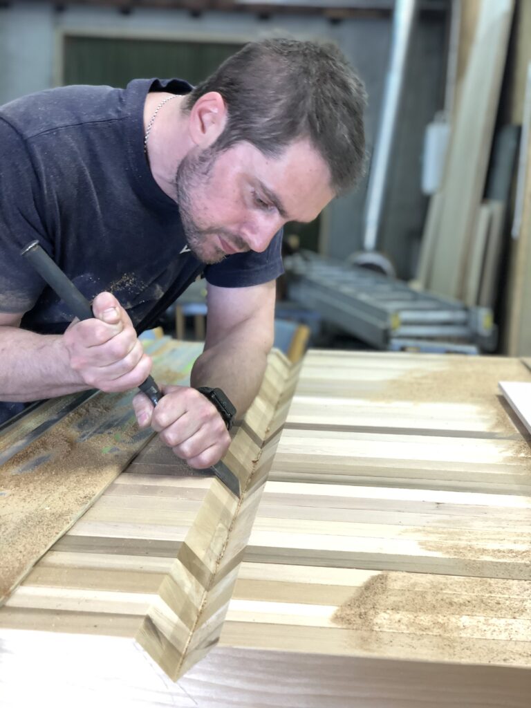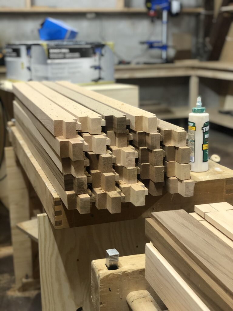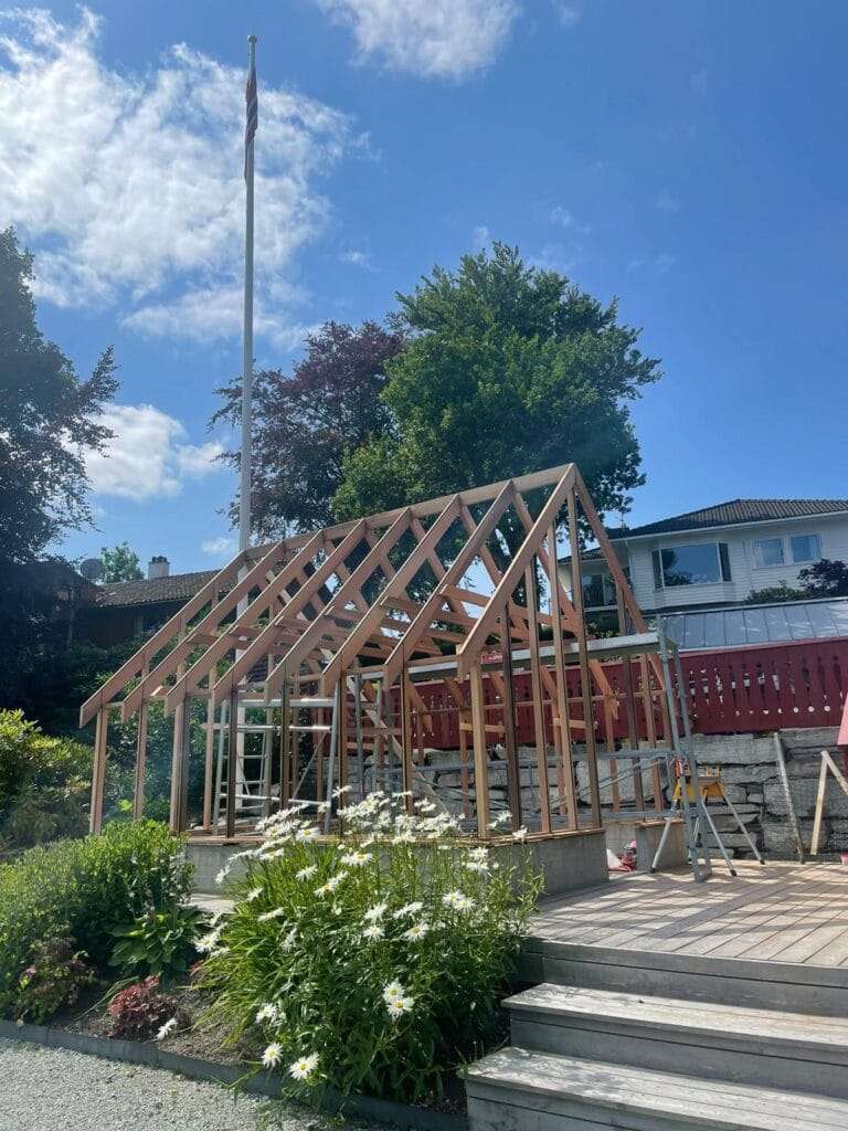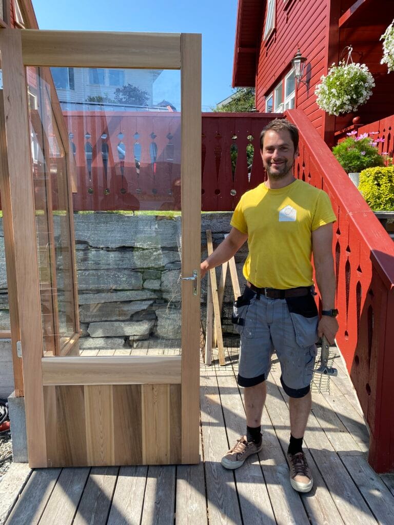 Vi produserte vinduer, dører og precut for alt trevirke før vi monterte drivhuset.